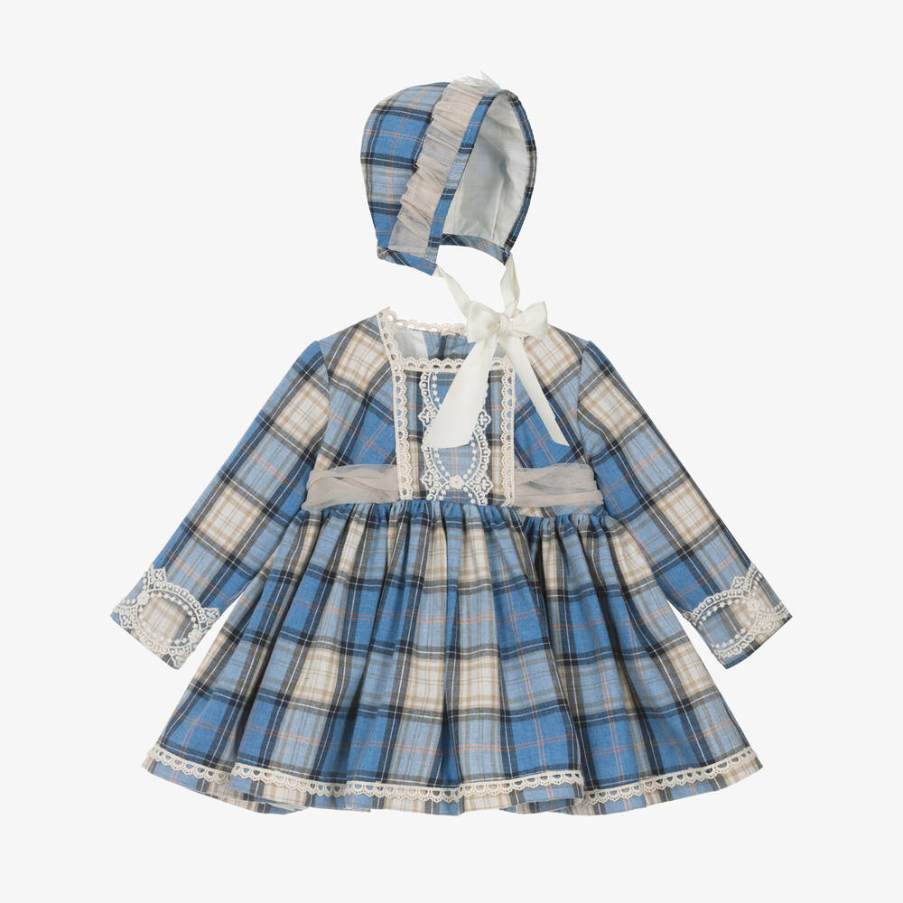 A lovely dress set for baby girls by Spanish brand Abuela Tata, designed in a blue and beige check. Made in a cotton twill blend, the long-sleeved dress has a square-shaped neckline and charming ivory lace trims. There is a pretty tulle sash on the waistline with a delightful bow on the back. The dress has a cotton-mix lining for a fuller shape and fastens neatly on the back with pearly buttons. It comes with a pair of matching knickers and a traditionally styled bonnet which fastens under the chin with satin ribbon ties.