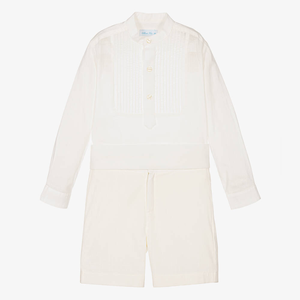 A traditionally styled shorts set for boys by Spanish brand Abuela Tata, made in soft and lightweight cotton. The collarless shirt has a pintuck pleat bib front with a half button placket, and button-fastening cuffs. The fully lined shorts fasten with a zip and button and have an adjustable waist for a comfortable fit. Lovely for a special occasion, the set comes with a removable ivory, tulle-covered cummerbund to complete the look.