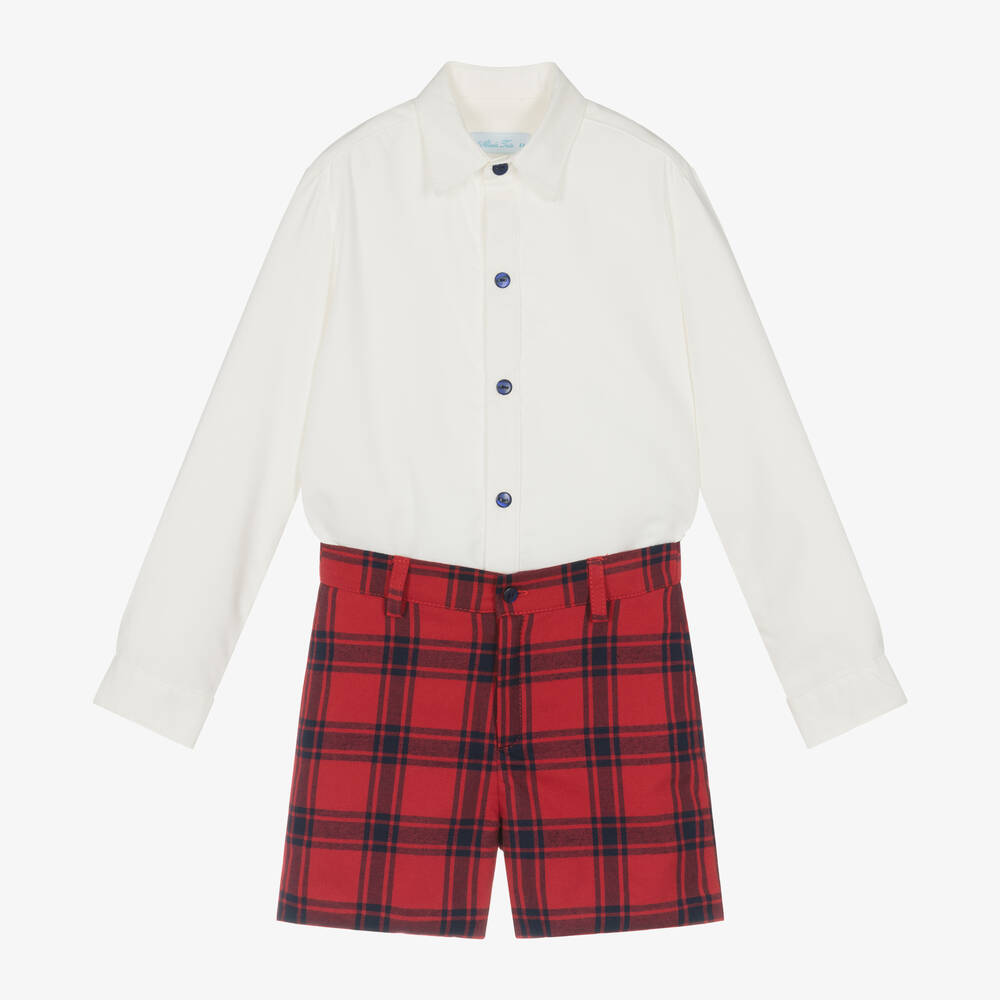 Boys ivory and red cotton shorts set by Spanish brand Abuela Tata. Made in lightweight twill, the classically styled ivory shirt has a pointed collar, long sleeves and pearlescent blue button fastenings. Patterned with a charming blue check, the red shorts are made in softly brushed cotton, with a lightweight voile lining. They fasten with a button and zip and have an adjustable waistband to ensure a comfortable fit.