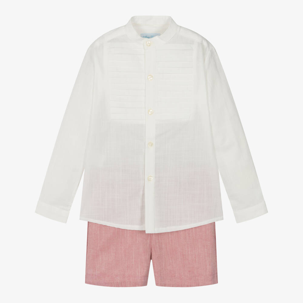 A traditonally styled red shorts set for boys from Spanish brand Abuela Tata. Made in lightweight cotton, the ivory collarless shirt has pleated detailing on the chest for a smart finish. The light red twill shorts fasten with a zip and branded button for a secure fit.