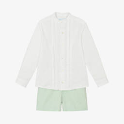 This smart green shorts set for boys by Abuela Tata, is ideal for the warmer months. The ivory long-sleeved shirt has a sleek grandad collar and stylish pintuck pleats on the front. The pleated shorts are made in a lightly textured fabric with a comfortable lining and an elasticated adjustable waistband for a great fit.