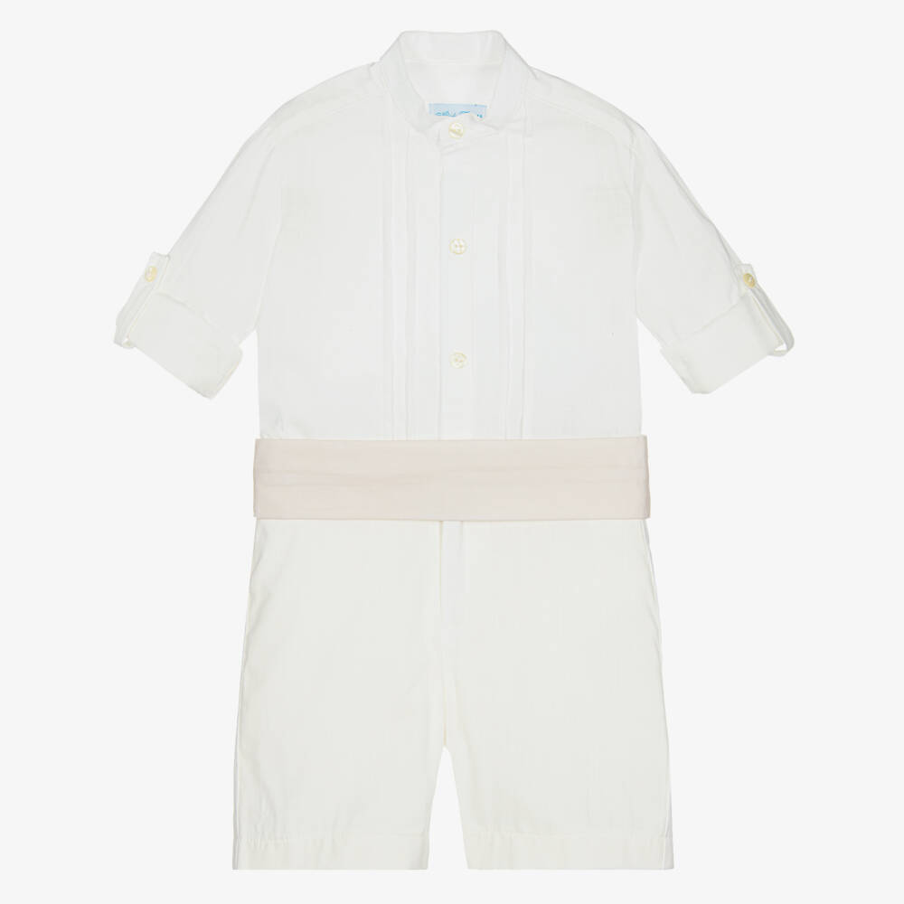 Smart three piece shorts set for boys by Spanish brand Abuela Tata, ideal for a special occasion. With a linen look, the collarless, white cotton shirt has pin tuck detailing on the front. The roll-up sleeves are secured with logo button fastenings. It comes with ivory, lined shorts that have a useful, adjustable waistband and fasten with a front button and zip. A smart, beige cummerbund completes the set, fastening with concealed poppers.
