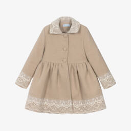 This lovely beige coat for girls by Abuela Tata offers a timeless elegance. Beautifully soft with a felted feel, it has wide, scalloped ivory lace trims and a full, gathered skirt for a classic silhouette, with a small, buttoned panel around the back of the waist. Fastening with large covered buttons, it has a silky satin lining for comfort.