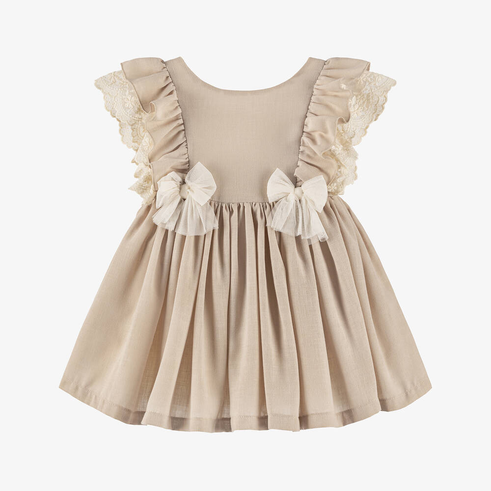 Girls delightful linen-look beige dress for special occasions by Abuela Tata, with eye-catching ivory lace ruffles over the shoulders and tulle bows on the waist. Designed with a stylish low-cut back, it has a full, flouncy skirt and a tulle sash that ties in a large, flamboyant bow.
