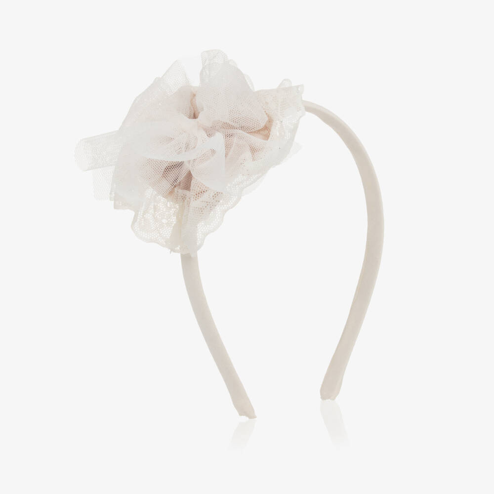 A lovely ivory hairband for girls by Spanish brand Abuela Tata. The flexible band is covered in soft fabric and topped with a beige rosette for a traditional look. It has a decorative tulle bow in the centre and a delicate lace trim for pretty detailing.