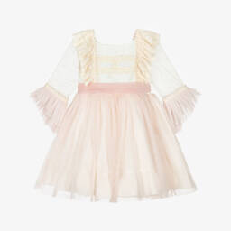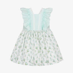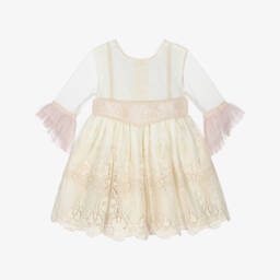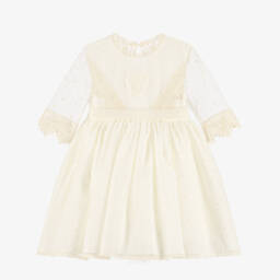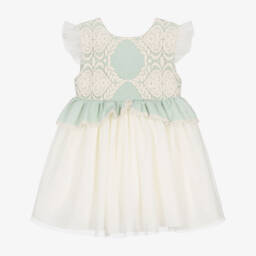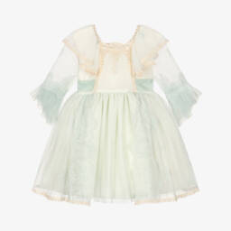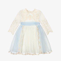 Ivory with pale blue trims, a beautiful special occasion dress for girls by Spanish brand Abuela Tata. Woven in soft cotton, this elegant design features pretty lace and tulle inserts, with delicate feather trims on the shoulders. Fully lined for comfort, the dress has a full skirt and fastens with buttons on the back. A detachable tulle sash ties into a lovely bow on the back.