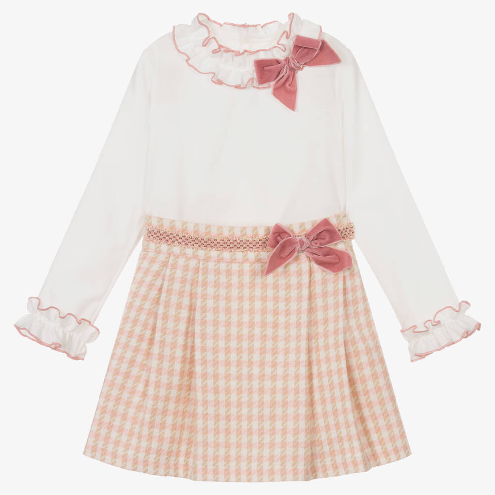 Charming ivory, pink and beige houndstooth check skirt set for girls by Spanish brand, Abuela Tata. The ivory blouse is made in lightweight cotton twill with pink-trimmed ruffles on the neck and cuffs and button fastenings on the back. The soft woven skirt has pretty braid trim on the waist and smart pleats for a flared shape. It has a ruffled lining for added volume, side button fastenings and an adjustable waistband. For a beautiful finish, both pieces are trimed with pink velvet bows.