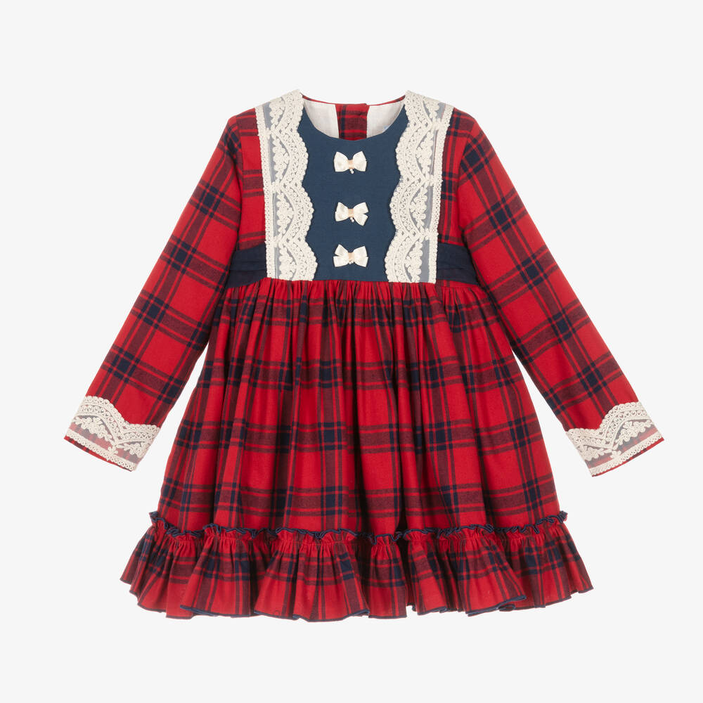 Heritage red tartan dress for girls by Abuela Tata, made in soft cotton-blend twill. The bodice has a delicate lace trims and satin bow appliqués on the front. The gathered skirt is lined in a cotton-blend petticoat for classic volume. It has button fastenings and a romantic tie-up sash belt on the back.