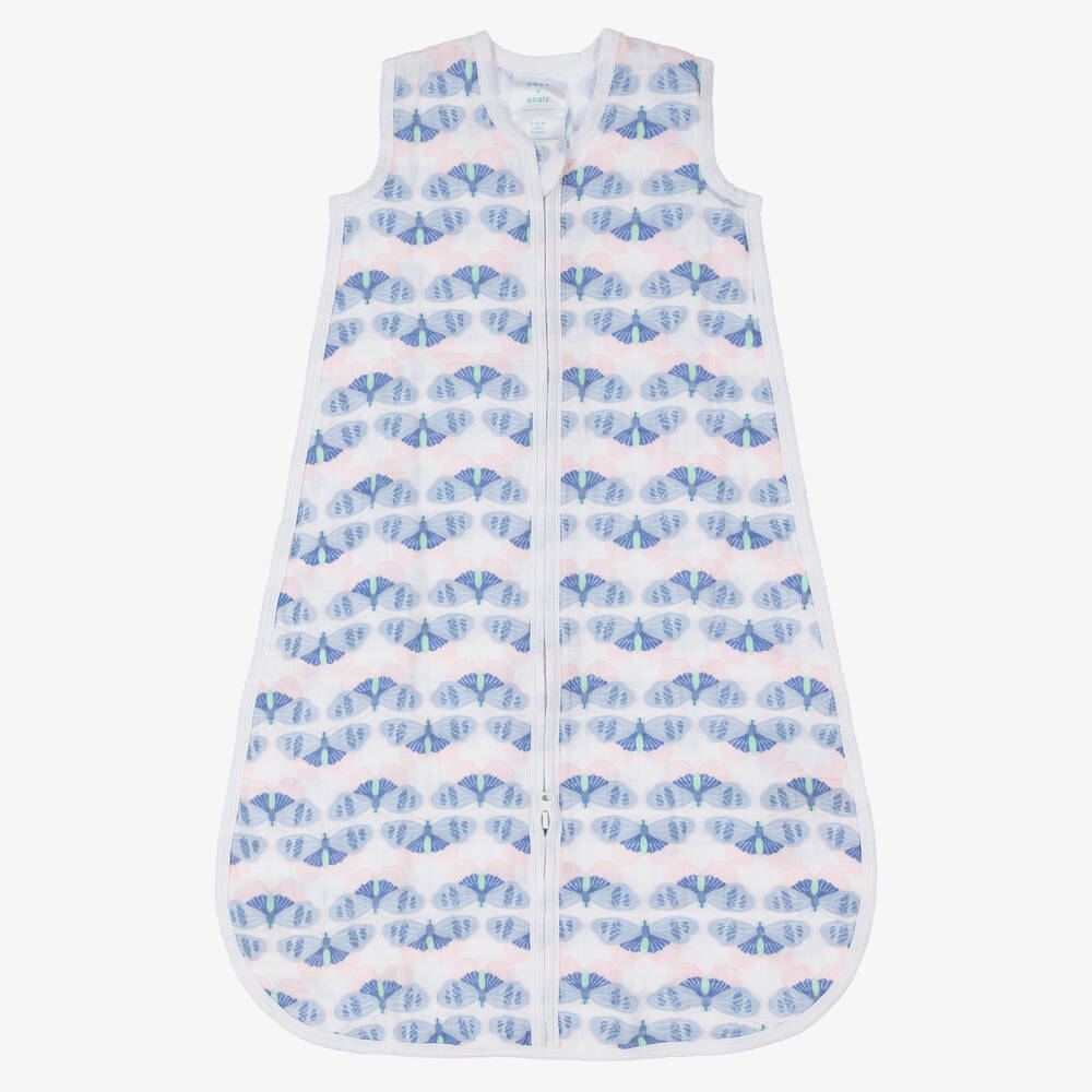A cotton muslin sleeping bag for baby girls by aden + anais, with a sweet pink and blue butterfly print. Super soft and lightweight, with a 1.0 tog warmth rating, this comforting sleep bag fastens with a zip on the front.