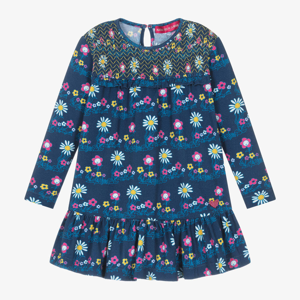 Pretty navy blue cotton dress for girls by Agatha Ruiz de la Prada, with a sweet white and pink daisy pattern. Made in soft, comfortable jersey with a cosy, brushed underside, it has a shirred bodice with a frilled trim. There is a pink heart logo charm sewn by the hemline and a keyhole button fastening on the back.
