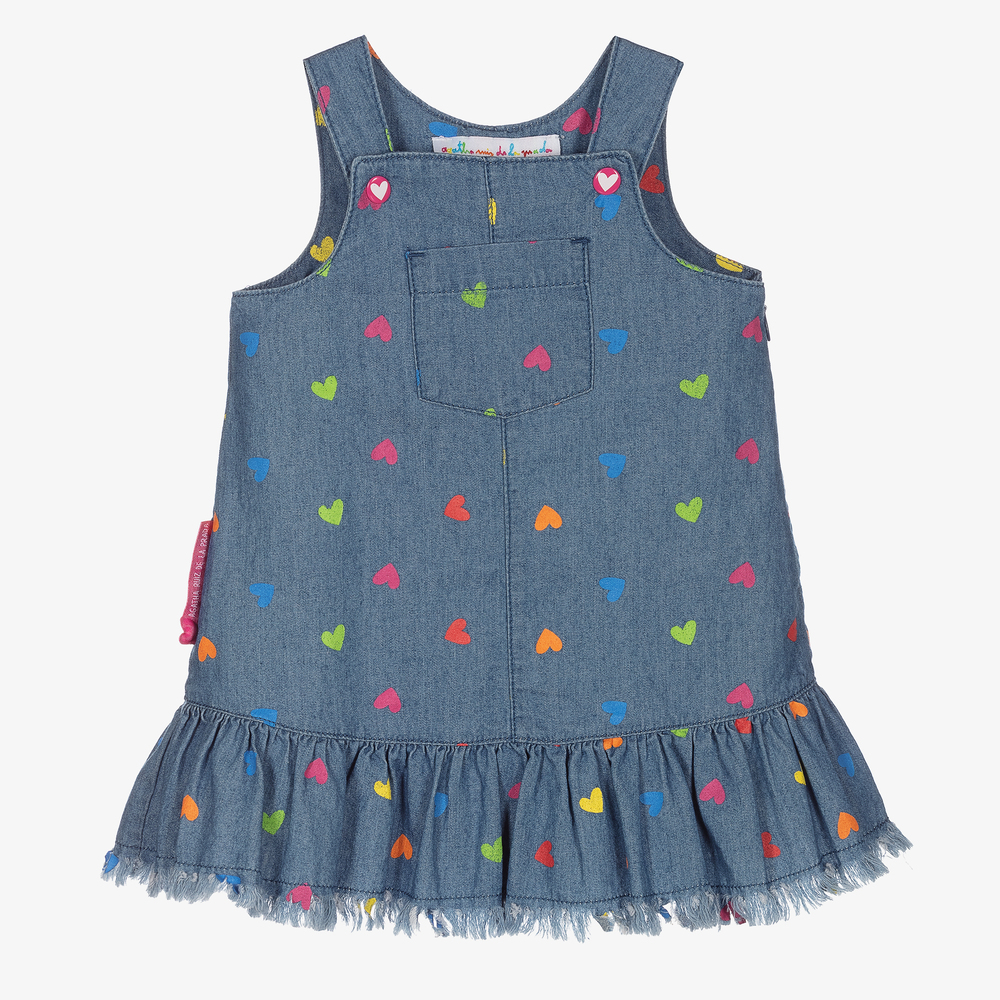 Pretty blue pinafore dress for girls by Agatha Ruiz de la Prada. Made in lightweight cotton chambray, it is printed with colourful hearts and has a frayed hemline. It has a pocket on the front, adjustable poppers on the shoulder straps and the brand's pink logo tab on one side seam.