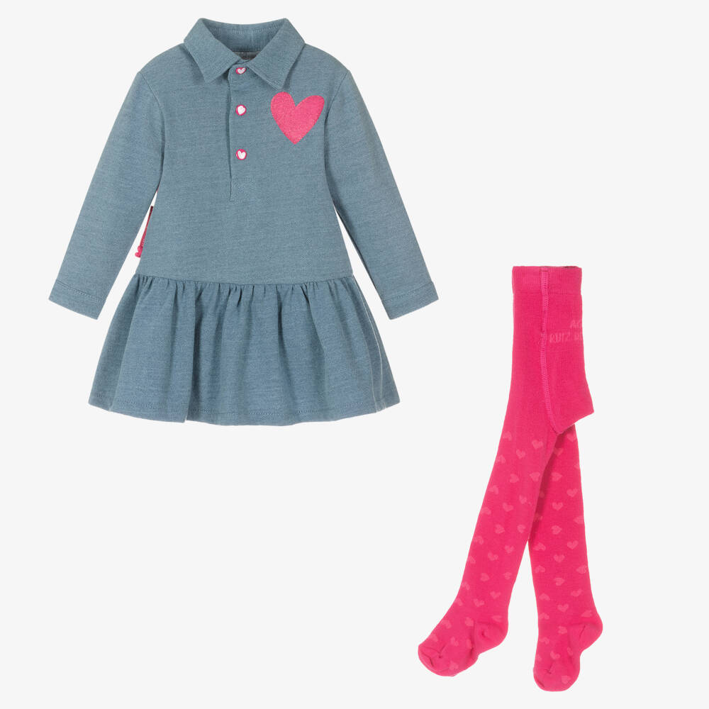 Cute cotton dress set for little girls by Agatha Ruiz de la Prada. The blue marl dress is made in comfortable jersey, with the designer's signature heart printed on the front in glittering pink and coordinating heart popper fastenings. Drop-waisted and with a gathered skirt, it has an oversized, bright pink heart insert on the back. Stretchy pink tights complete the set, patterned with contrasting pink hearts and a logo around the back.