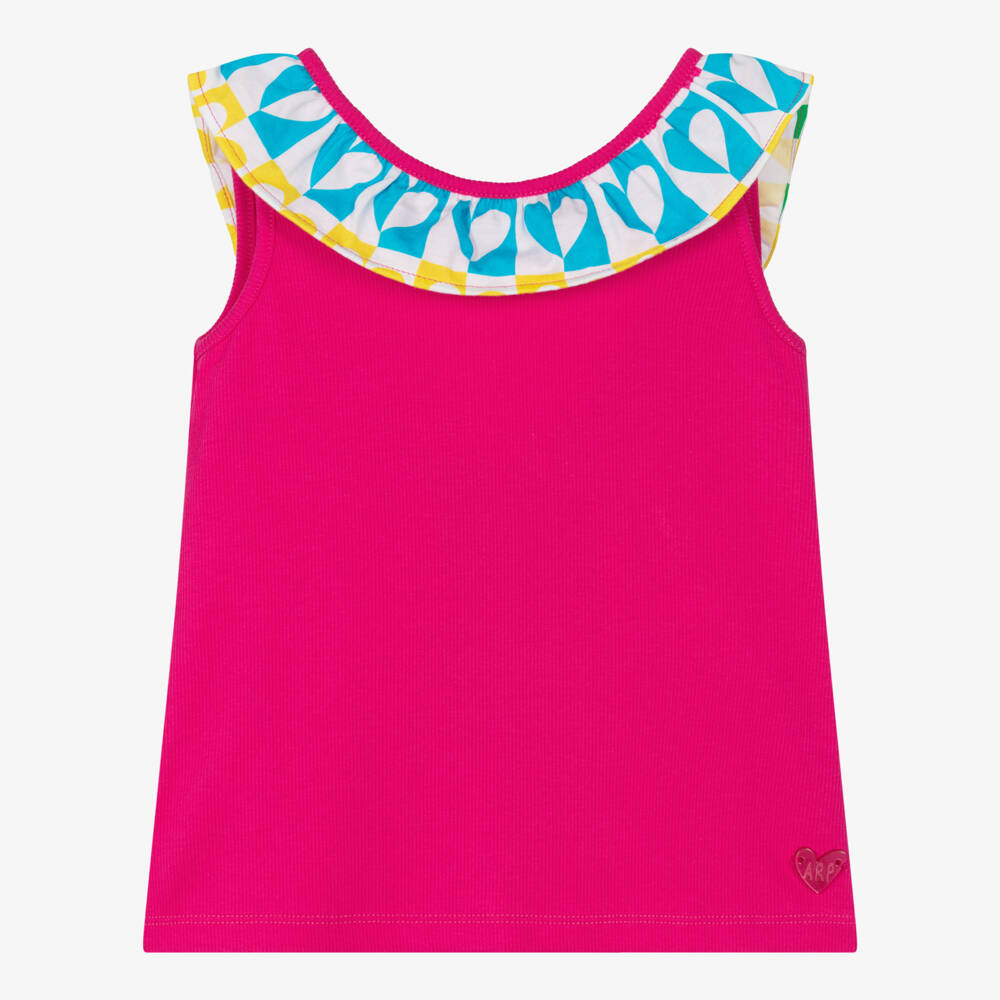 Casual sleeveless T-shirt for girls by Agatha Ruiz de la Prada, in a bright shade of fuchsia pink. Made in ribbed cotton jersey, this easy to wear top has a pink logo heart charm near the hem and a colourful heart print ruffle on the neckline. The back has a low scoop shape with a pretty bow for a girly look.