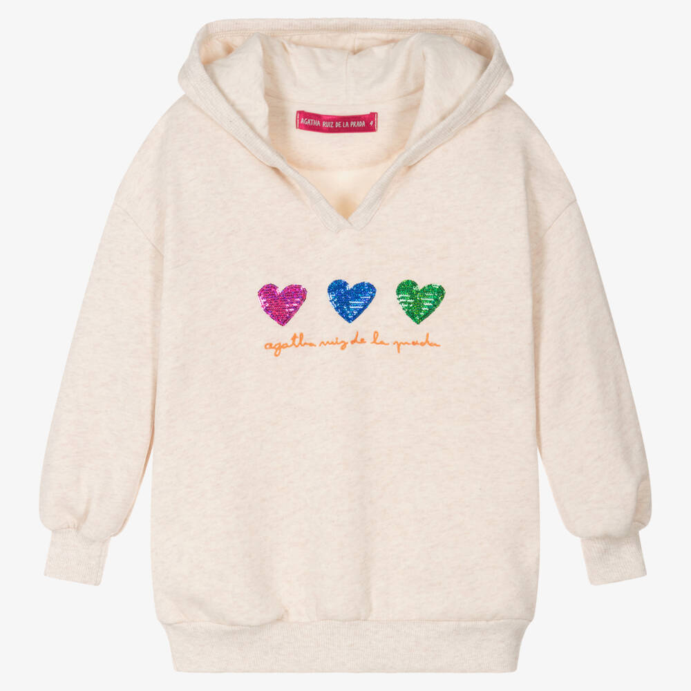 Ivory marl cotton hoodie for girls by Agatha Ruiz de la Prada, made in a soft sweatshirt jersey. Casual and comfortable, it is soft and fleecy inside, with stretchy ribbed cuffs and hem for an extra cosy feel. There are sparkling, sequinned heart appliqués in pink, blue and green on the front, with the designer's name embroidered below in orange.