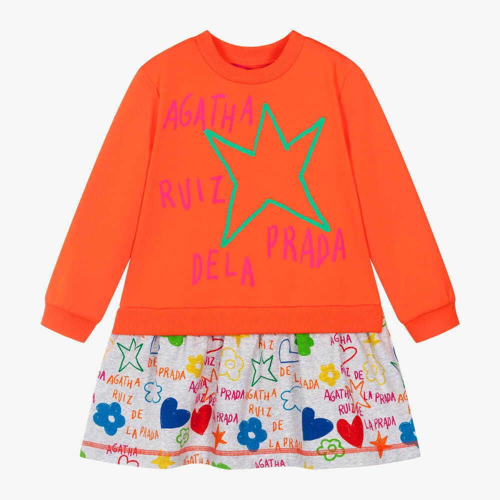 Fun orange and grey marl cotton dress for girls by Agatha Ruiz de la Prada, with the look of a two-piece. Made in soft jersey with a cosy, fleecy inside, the top part is in the style of a sweatshirt, with a large, green daisy and neon pink logo. It has long sleeves and neat, ribbed cuffs. The gathered skirt has a fun, colourful, doodling pattern with logos, hearts, stars and flowers. Easy to wear, it simply pulls on over the head.