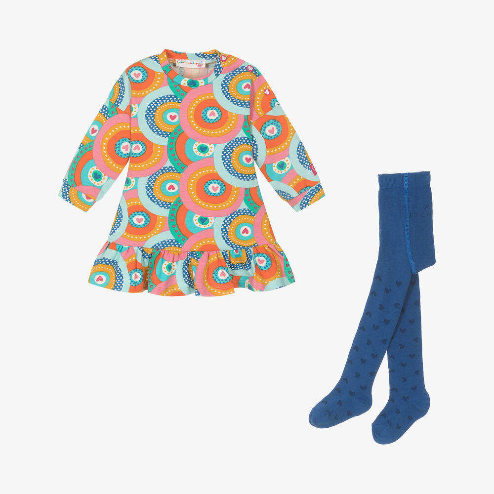 A vibrant dress set for girls by Agatha Ruiz de la Prada, patterned with orange, blue and pink rainbows and hearts. Made from cotton blend jersey, the dress has long sleeves and a pretty frilled hem. Smaller sizes have cute heart popper fastenings on one of the dropped shoulders. A pair of bright blue knitted tights with a heart pattern completes the cute look.