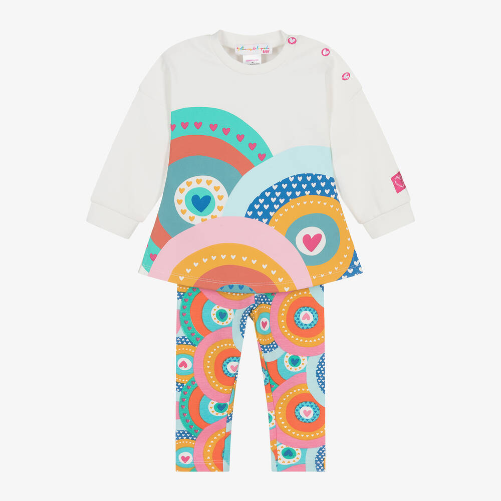 In a vibrant rainbow and pink heart theme, this colourful leggings set for girls is by Agatha Ruiz de la Prada. This comfortable, casual outfit is made in soft cotton blend jersey. The off-white long-line top has pink heart popper fastenings on one of the dropped shoulders and a branded tab stitched on one of the long sleeves. The full-length leggings are printed with a matching pattern for a complete look.