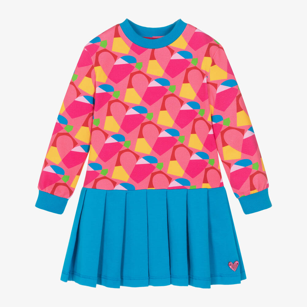 Eye-catching pink and blue cotton dress for girls by Agatha Ruiz de la Prada, made in comfortable jersey. The top has a stand-out, geometric heart pattern, highlighted in yellow and green, with neat, ribbed trims. The blue pleated skirt has a pink heart logo charm sewn by the hemline. Easy to wear, the dress simply pulls on over the head.