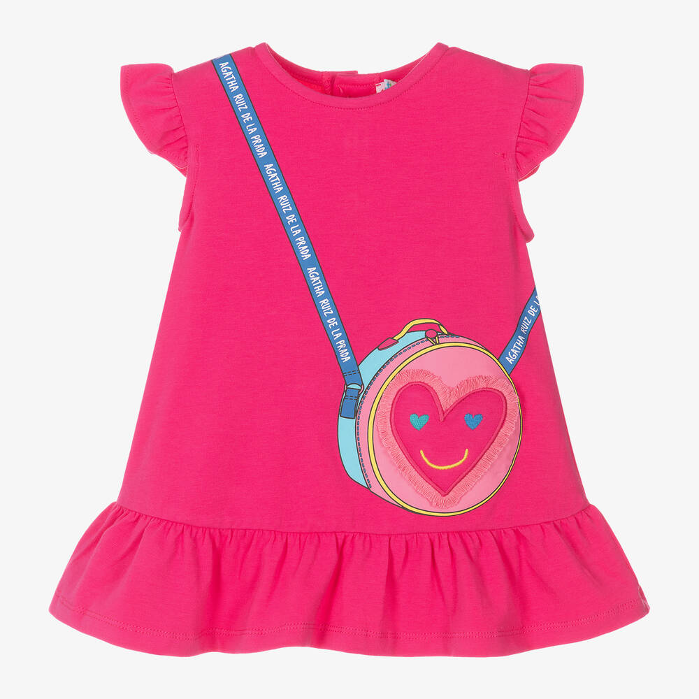In bright fuchsia pink, this cotton jersey dress for girls is by Agatha Ruiz de la Prada. It has a colourful shoulder bag motif on the front, featuring an embroidered heart appliqué and logo branding. This fun dress has a frilled hemline, capped ruffle sleeves, and heart button fastenings on the back.