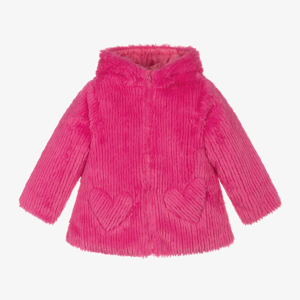 A gorgeous fuchsia pink hooded coat for girls by Agatha Ruiz de la Prada, made from beautifully soft and luxurious faux fur with a textured stripe pattern. For a truly cosy feel, it is warmly padded and lined in silky satin. It fastens neatly with a zip and has heart-shaped pockets on the front for a cute finish.