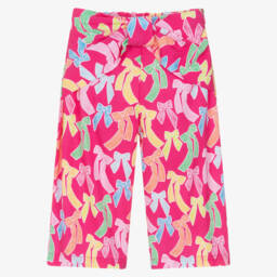 Lovely pink flared trousers for girls by Agatha Ruiz de la Prada. Made from soft lyocell and cotton blended ribbed jersey, they have an elasticated waistband to ensure a comfortable fit. Patterned with a fun red and pink heart print, they have a wavy hemline of the cuffs for a sweet finish.