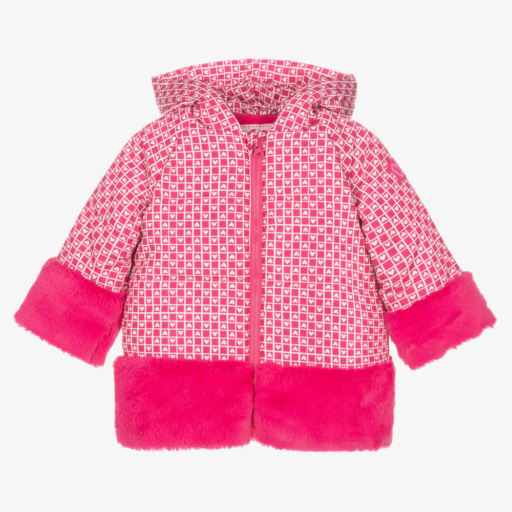 A gorgeous bright pink hooded coat for girls by Agatha Ruiz de la Prada, patterned in the brand's signature love-hearts. Silky smooth, it is softly padded for warmth and has a cosy polar fleece lining. There are plush faux fur trims on the cuffs and hem for a stylish look, with internal ribbed cuffs to keep out chilly winds. It fastens with a chunky zip down the front and has concealed side seam pockets for carrying small essentials.