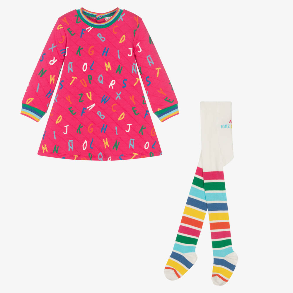 Fun and colourful dress and tights set for girls by Agatha Ruiz de la Prada. Made in a softly quilted cotton-blend jersey, the bright pink dress is patterned in multicolour letters, with rainbow striped ribbed trims. Smaller sizes fasten with poppers on the back for quick and easy dressing. Patterned in matching rainbow stripes and embroidered with a matching coloured logo on the back, the soft and stretchy tights complete this girly outfit.