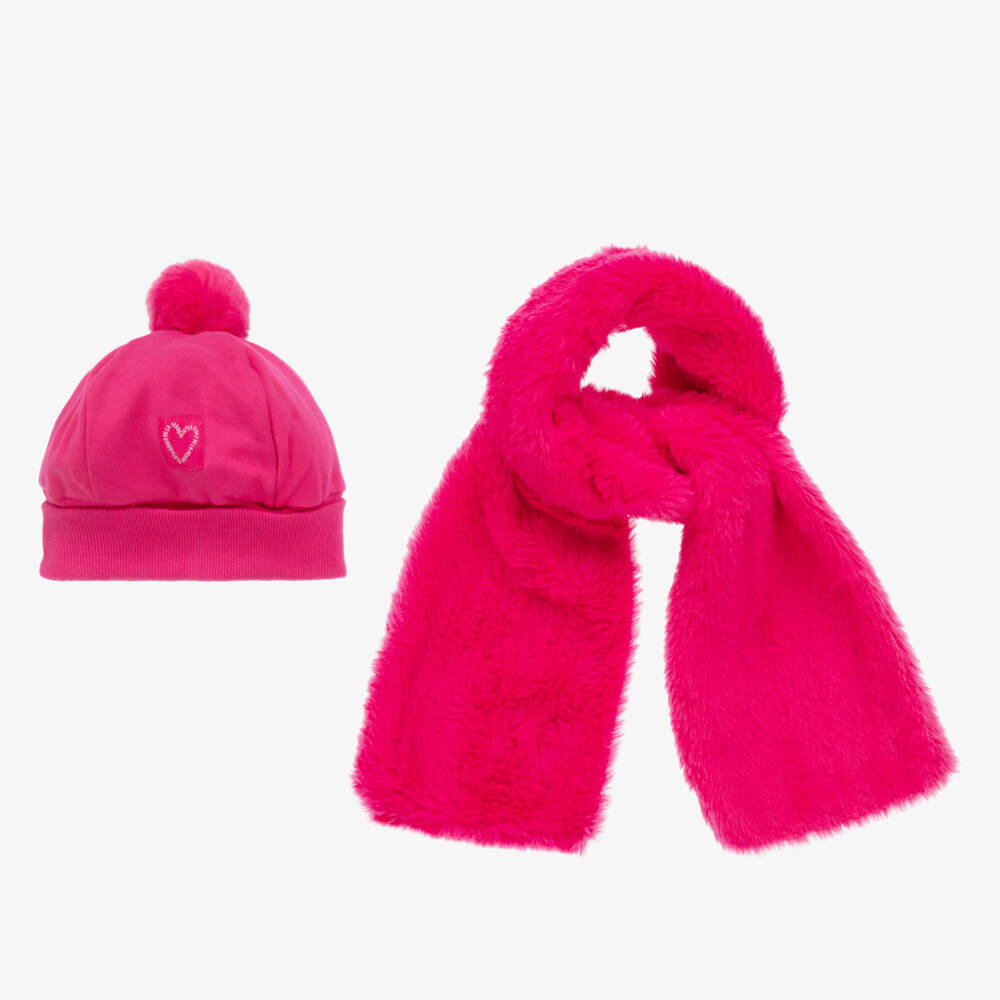 Fuchsia pink hat and scarf set for girls by Spanish brand Agatha Ruiz de la Prada. The comfortable hat is made in soft, stretchy, cotton-blend jersey with a heart logo badge, a ribbed turned-up brim and a faux fur pom-pom on top. It comes with a super soft faux fur scarf that matches the pom-pom and will keep little necks warm and cosy.
