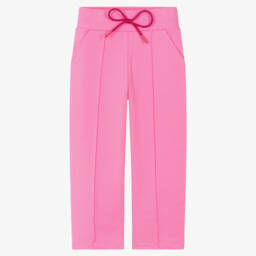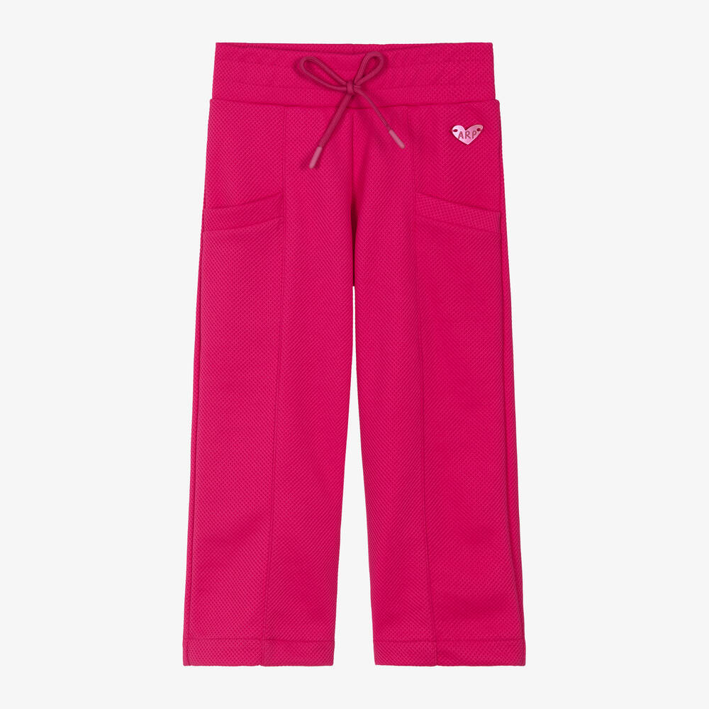 Fuchsia pink straight-leg joggers for girls by Agatha Ruiz de la Prada. Made from stretchy piqué, this casual style has useful pockets on the front and a comfortable elasticated waistband with a faux drawstring detail. There is a pearlescent heart-shaped logo charm stitched on one side for an added branded touch.