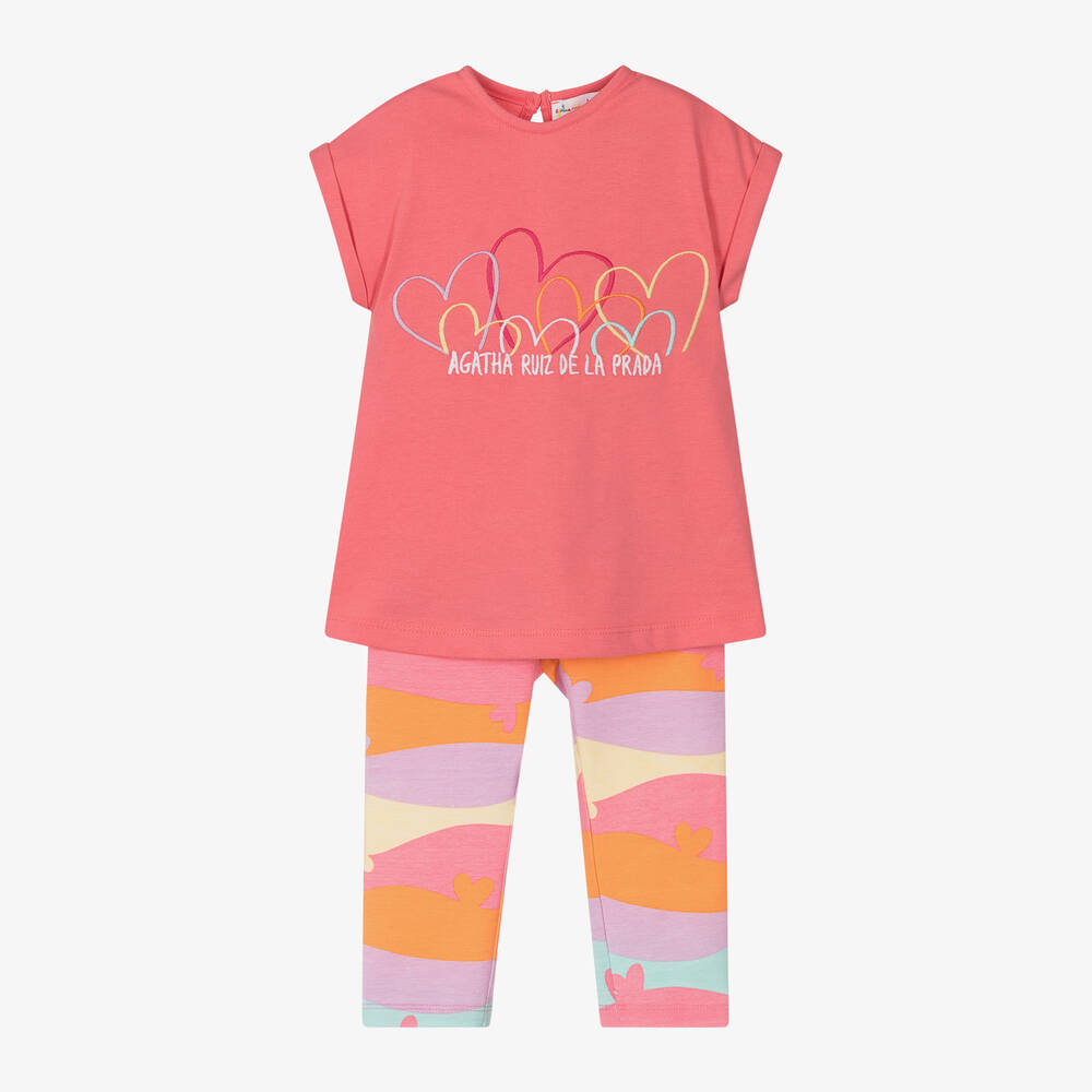 Casual and comfortable for girls, this cotton jersey leggings set is by Agatha Ruiz de la Prada. The pink tunic top is embroidered with colourful hearts and a logo on the front, with a keyhole button fastening on the back. Patterned in a colourful wavy print with cute love hearts, the leggings have a gently elasticated waist.