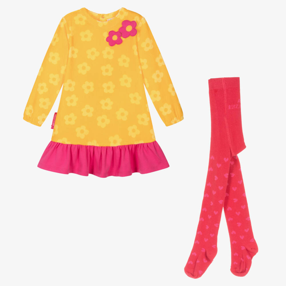 Bright and colourful yellow and pink dress and tights set for girls by Agatha Ruiz de la Prada. The casual yellow velour dress has a tonal floral pattern, with pink and yellow appliqué flowers on the front. It has a dropped waist with a pink jersey ruffle hem and popper fastenings on the back. The matching pink tights are made in a soft and stretchy cotton-rich knit and are patterned with tonal pink hearts to complete this cute outfit.