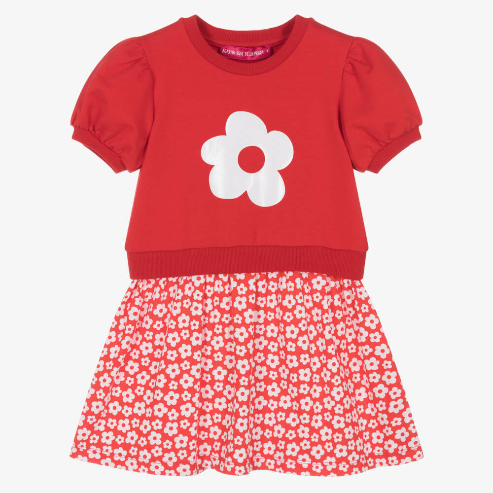Cute red cotton dress for girls by Agatha Ruiz de la Prada, with the look of a two piece. The red bodice has pretty puffed sleeves and a bold white flower motif printed on the front, matching the pattern on the gathered skirt. The dress is made in soft, comfortable cotton and is easy to wear, simply pulling on.
