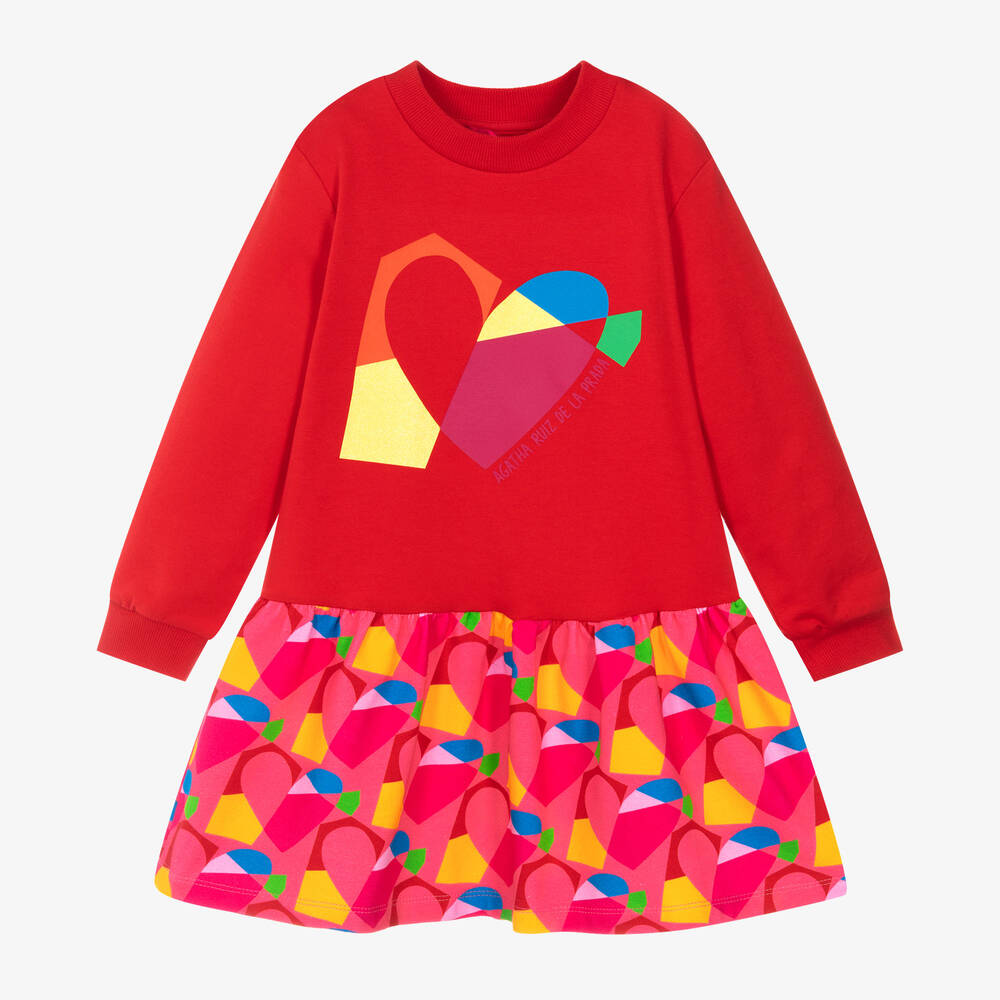 A red cotton sweatshirt dress for girls by Agatha Ruiz de la Prada, with a bright and vibrant heart-patterned skirt. Made in soft, mid-weight jersey, this long-sleeved dress has stretchy ribbed trims and a casually styled dropped waist. For designer appeal, there is a colourful abstract heart logo motif on the front.