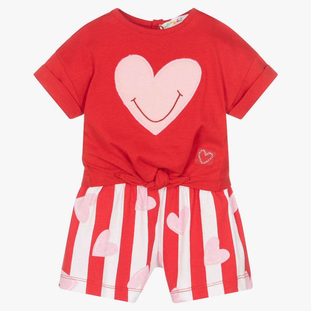 Pretty red and white shorts set for girls by Agatha Ruiz de la Prada, made in a soft cotton jersey. The T-shirt has a padded pink happy heart and a branded tab sewn on the front, with a knotted tie detail at the waist. There are useful popper fastenings on the back. The striped shorts have a heart print with a stretchy ruffled waist for a comfortable coordinated outfit.