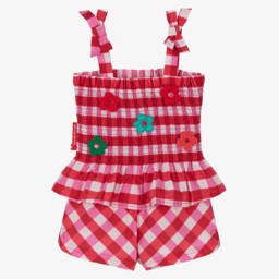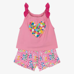 Fun and vibrant, this white cotton jersey shorts set for little girls is by Agatha Ruiz de la Prada. The vest top features a bold strawberry motif in pink and green and has pink heart poppers for easy fastenings. Patterned in matching strawberries, the shorts have frilly trims and a gently elasticated waist.
