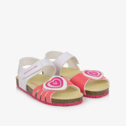 White faux leather sandals for girls by Agatha Ruiz de la Prada. Lined in a soft felt for comfort with a moulded footbed, these sweet sandals have a velcro-fastening strap across the toes with a colourful floral appliqué and a strap around the front of the ankle with a faux buckle and rubberised logo on the side. They have ridged, non-slip rubber outer soles for good grip.