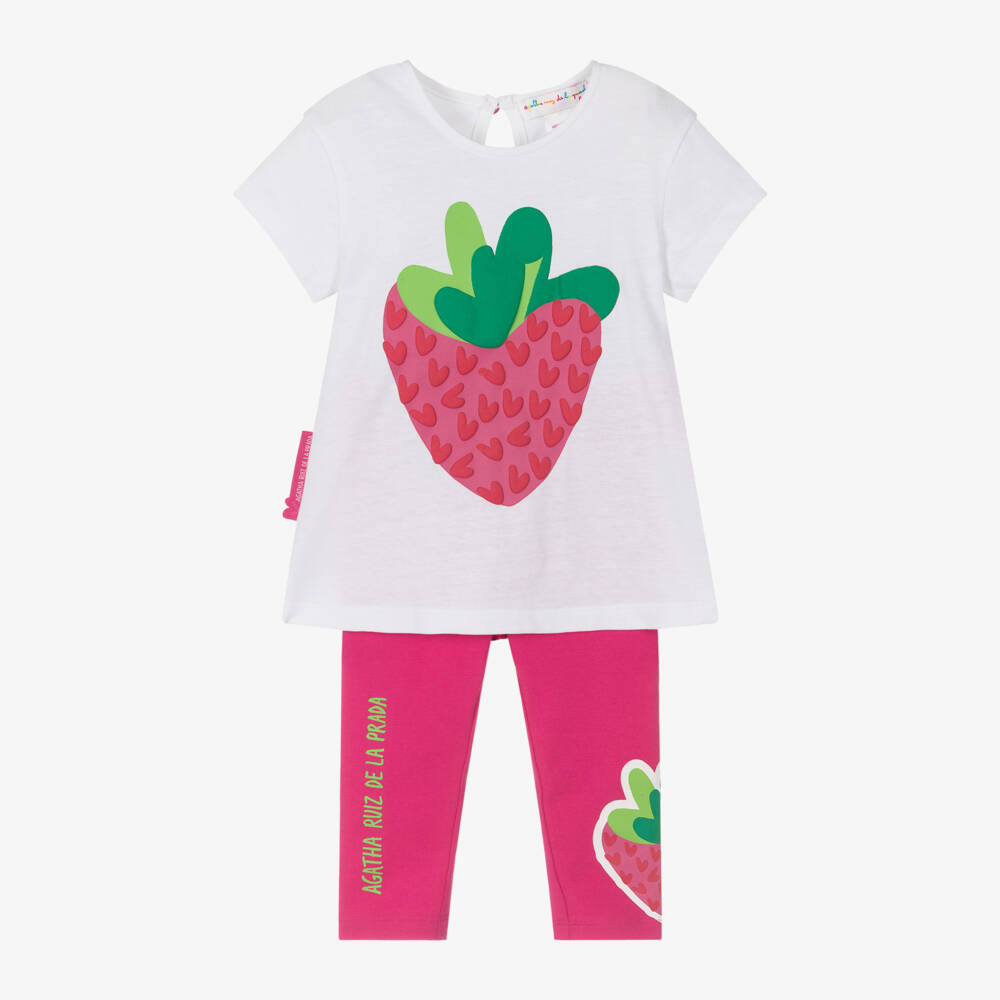 Casual and comfortable for girls, this cotton jersey leggings set is by Agatha Ruiz de la Prada. The white T-shirt features a bold strawberry motif in pink and green, with a keyhole button fastening on the back. Printed with a matching strawberry motif on one leg, the fuchsia pink leggings have a gently elasticated waist.