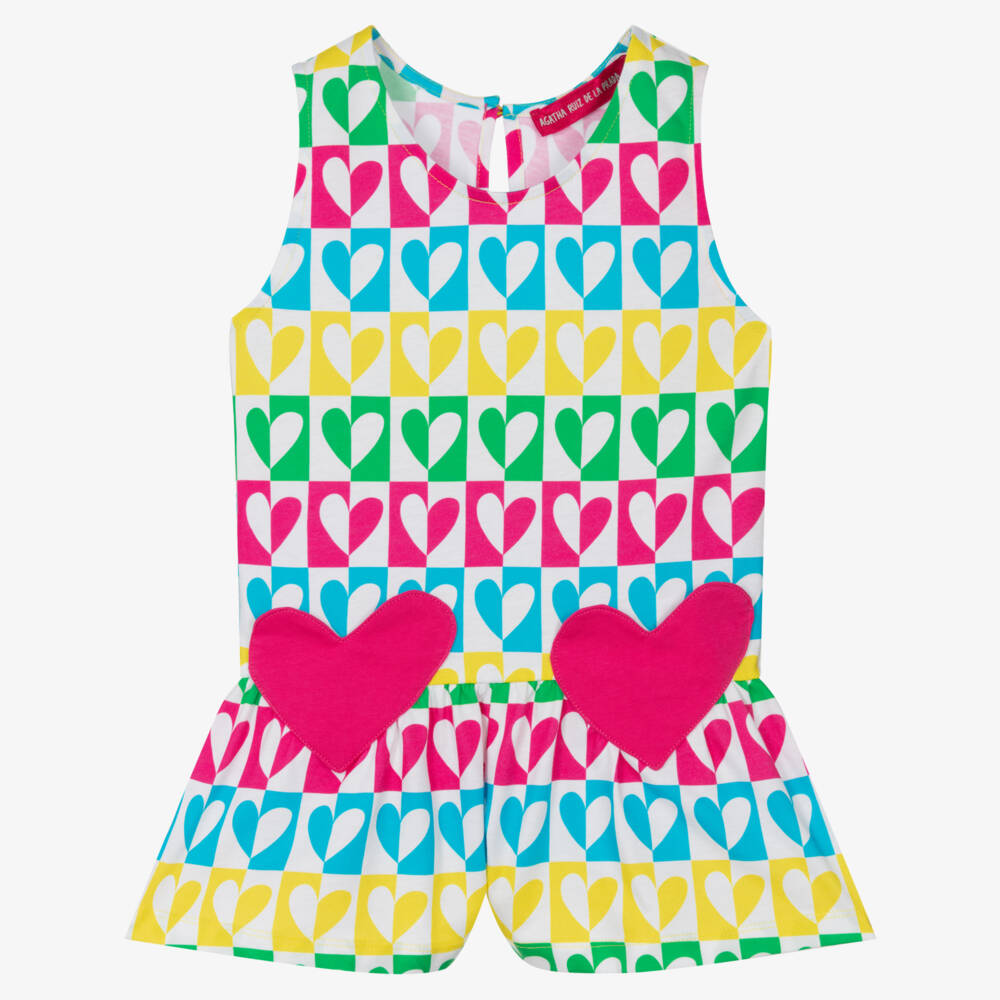 Pretty white and pink playsuit for girls, by Agatha Ruiz de la Prada. Made in soft cotton jersey, this easy-to-wear one piece has a colourful hearts print all-over with heart-shaped pockets. It fastens a single button on the back for easy, stylish dressing.