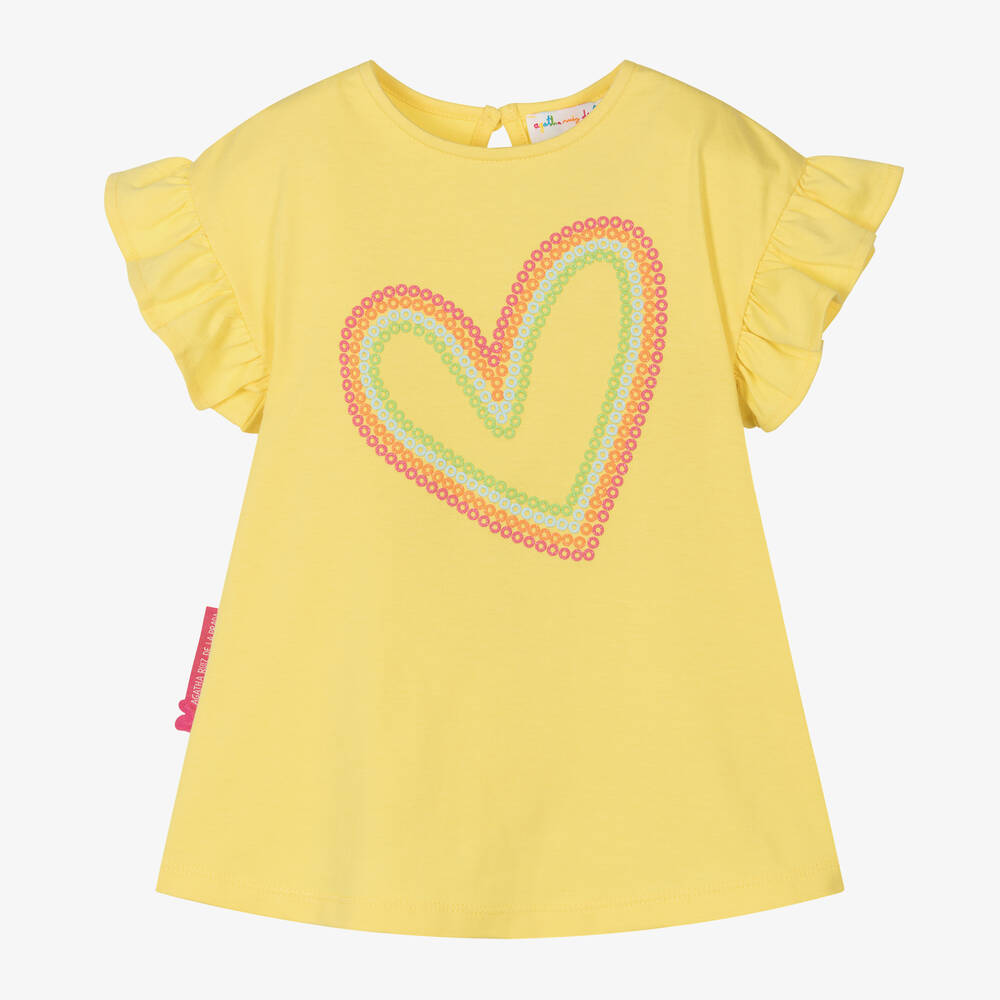 Bright yellow dress for girls by Agatha Ruiz de la Prada, made in soft cotton jersey. It has a fun and colourful heart design on the front, with glittery detailing for added sparkle. There are pretty ruffled sleeves, a keyhole back button fastening, and a branded tab on the side seam to finish.