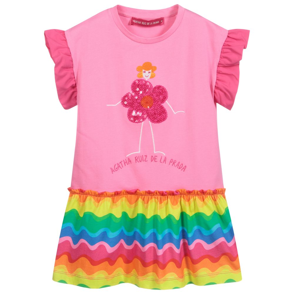 Pretty pink cotton jersey dress for girls by Agatha Ruiz de la Prada, with ruffled cotton sleeves. It has a pink flower girl on the front, shimmering with sequins and the brand's logo embroidered below. The gathered skirt is patterned with wavy stripes in pink, yellow, orange, green and blue.
