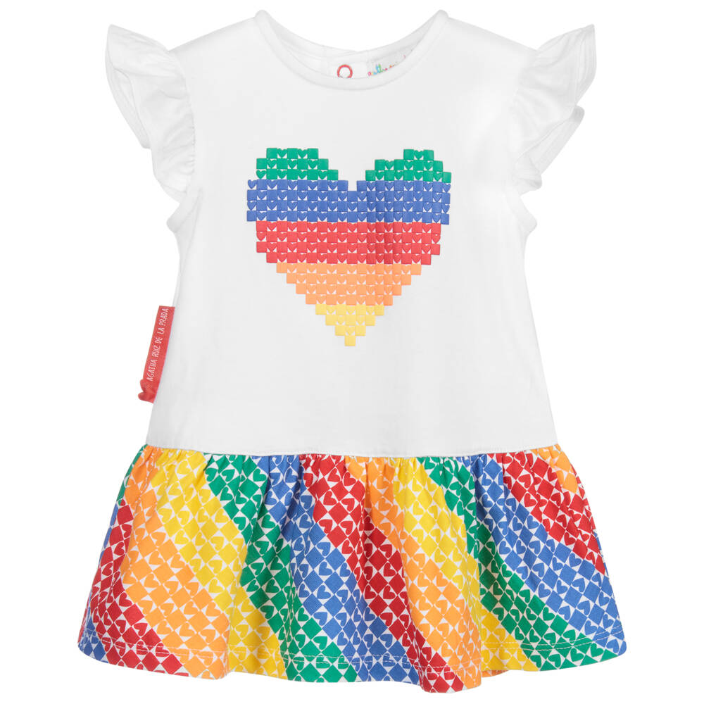 Little girls dress and knickers set by Agatha Ruiz de la Prada, made in soft cotton jersey. The dress has a rubberised rainbow heart print, which matches the skirt and knickers. It fastens with poppers on the back.