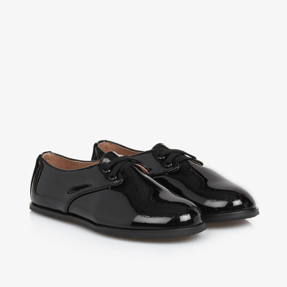 Smart black slip-on shoes for boys by Age Of Innocence, handcrafted from glossy patent leather. Comfortably lined in soft leather, this stylish design has elasticated laces allowing them to slip on easily. They have a lightly padded insole and slim, non-slip rubber outer sole.