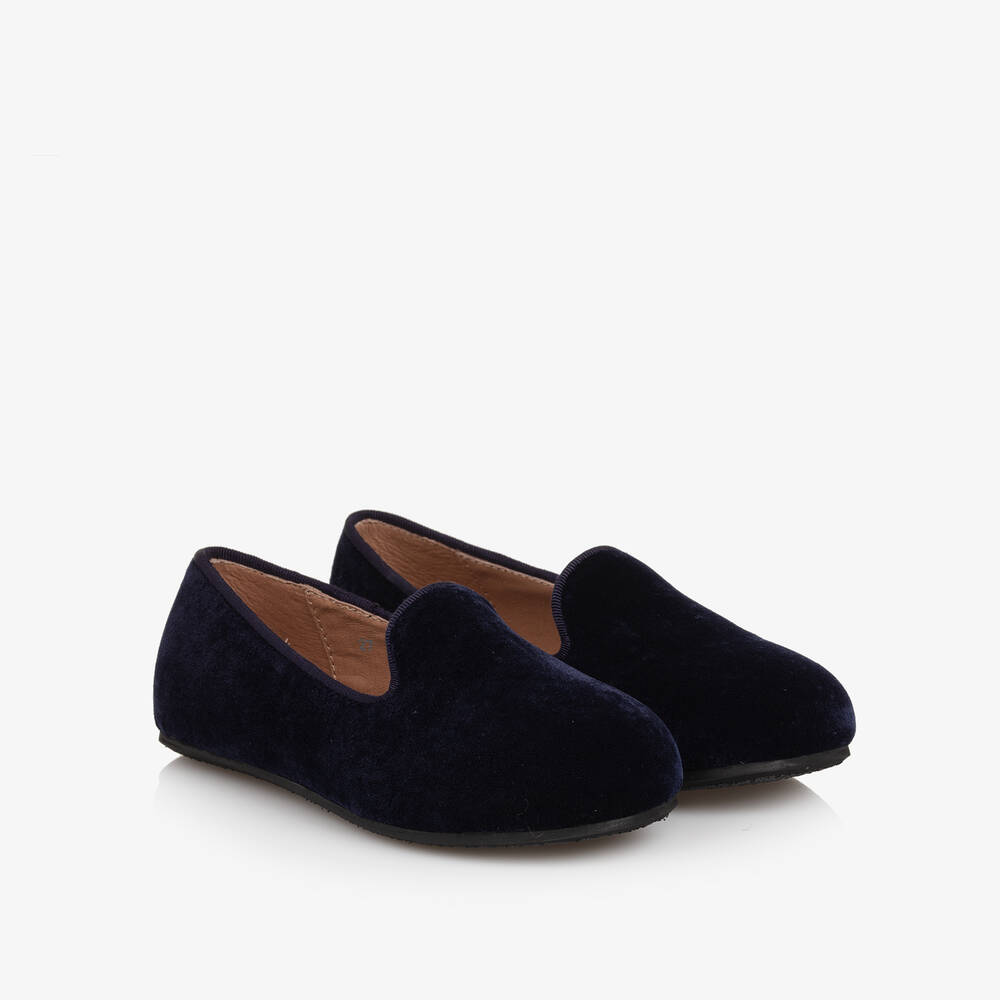 Navy blue loafers for boys by Age Of Innocence, handmade in soft and sumptuous velvet. A timeless slip-on style, they are lined in soft leather with a lightly cushioned insole and slim, non-slip rubber outer sole.