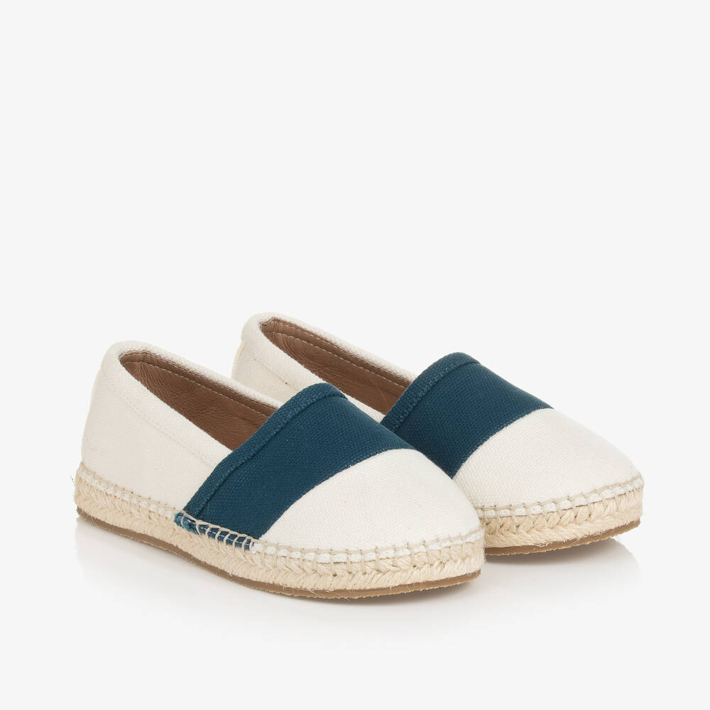 Timeless off-white canvas espadrilles for boys handmade by British brand Age of Innocence, with a navy blue band across the foot. Ideal for summery weather, they have a classic rope-style trim around the non-slip sole and are lined in soft, supple leather. Easy to wear, they simply slip on.