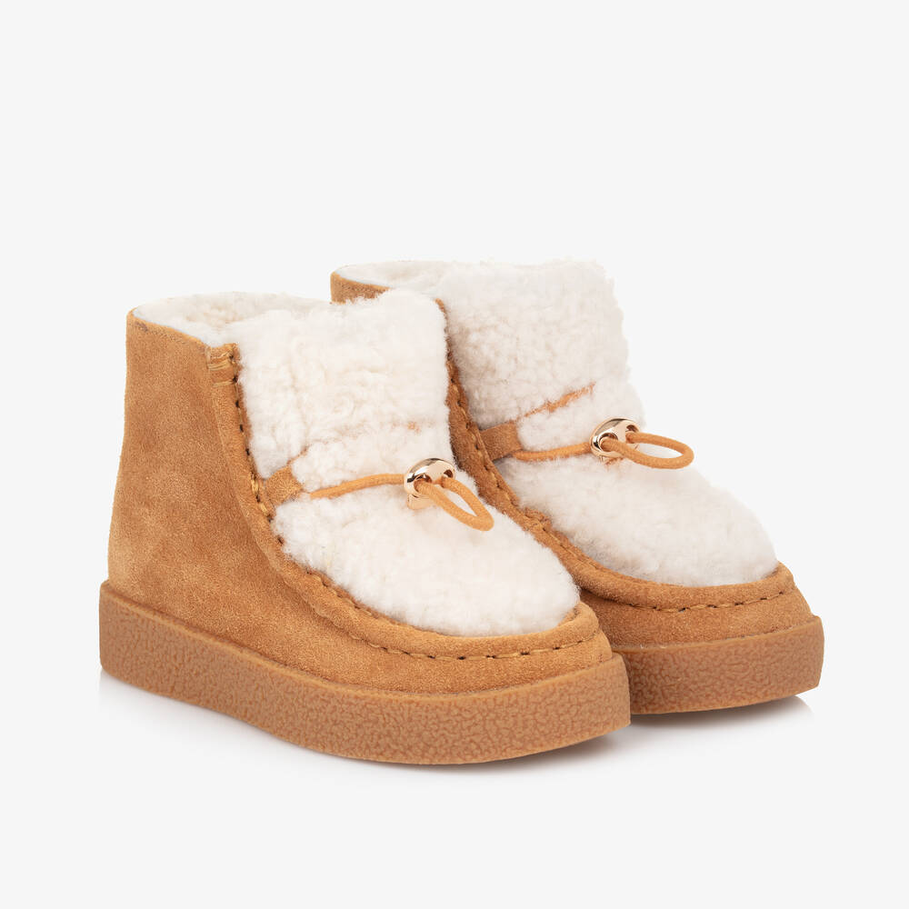 Beautifully cosy and stylish for girls, these beige suede ankle boots are from Age of Innocence. Handcrafted for comfort, they have a soft ivory shearling lining and insole, and a lightweight, chunky crepe rubber sole. Ideal for an après ski vibe, they have a drawstring fastening on the front with a shiny gold toggle to complete the look.