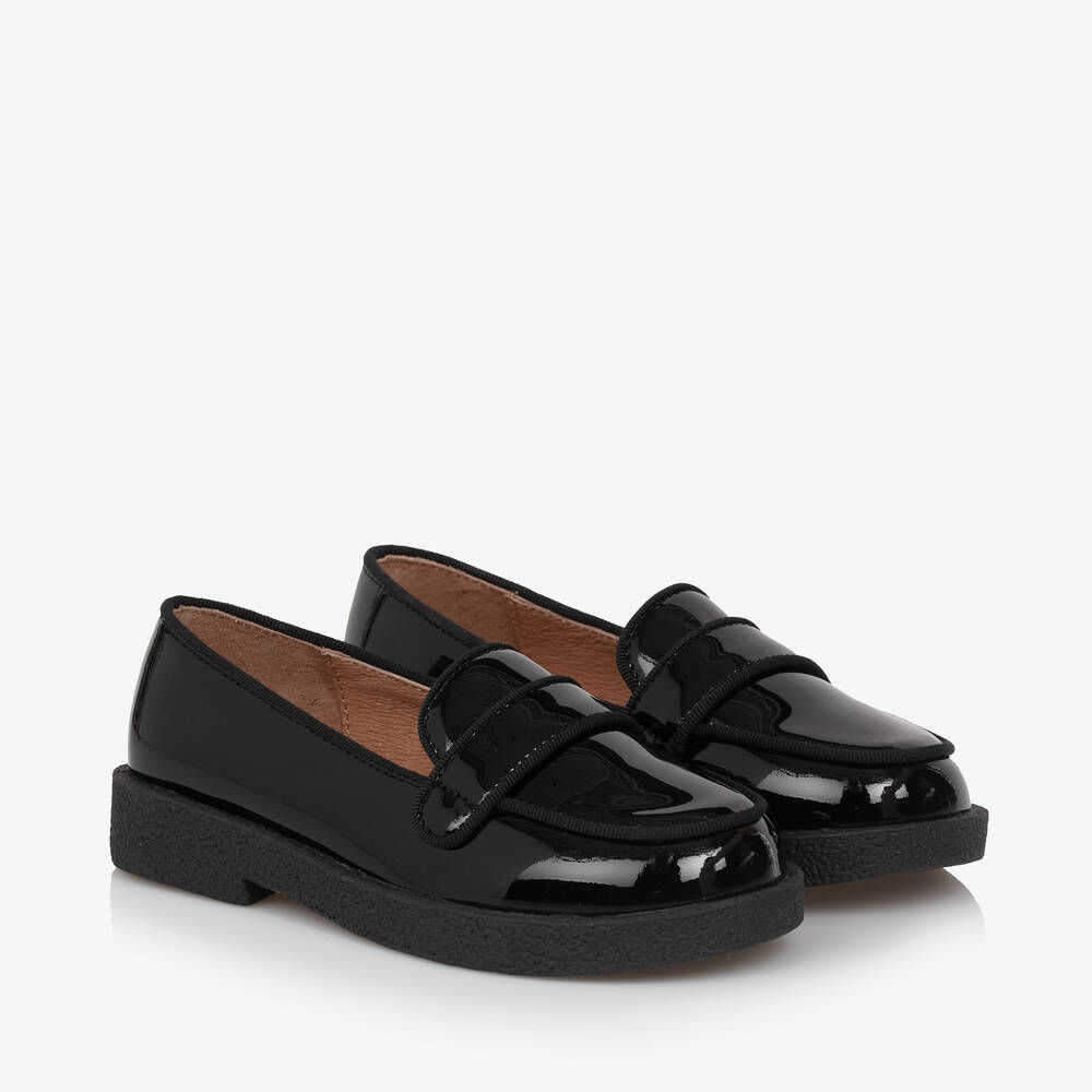 Black loafer shoes for girls by Age of Innocence, handcrafted in patent leather with a soft leather lining and insole. A slip-on style, these smart, glossy shoes have an iconic silhouette for timeless wear. They have a lightweight feel and a textured crepe rubber outsole.