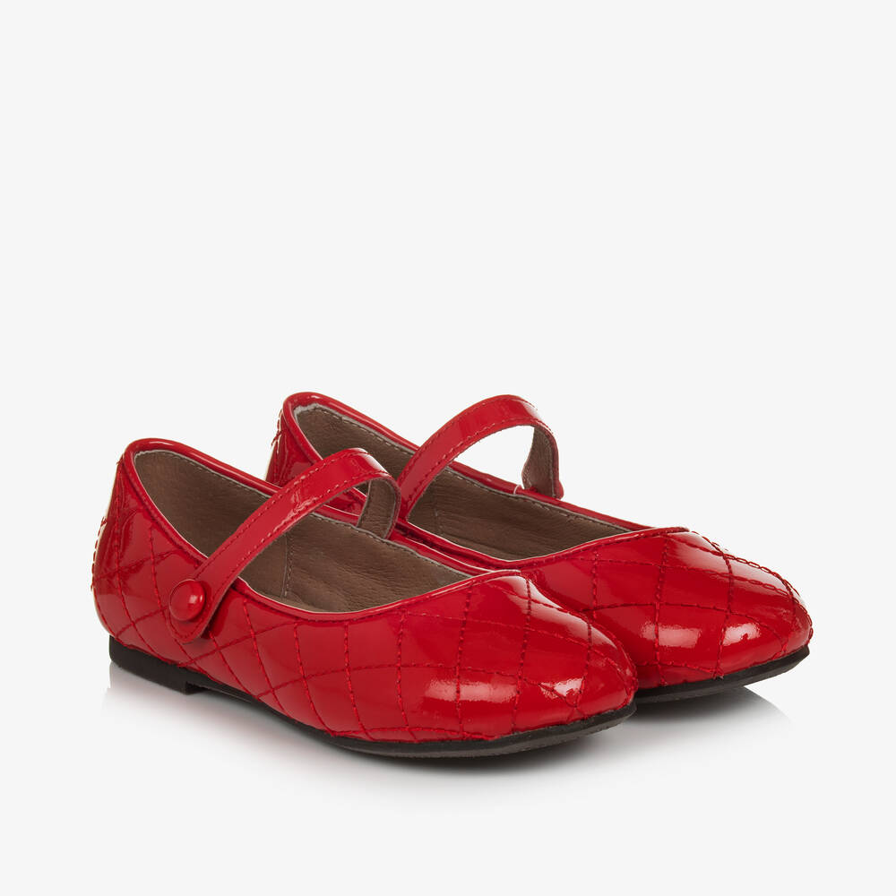 Stylish red shoes for girls by British brand Age Of Innocence, handcrafted from smooth quilted patent leather. In the style of a classic bar shoe, these slip-on shoes have decorative straps across the front with an elasticated button detail on the side. Lined in soft leather with a lightly padded insole, they have non-slip rubber outsoles for good grip.