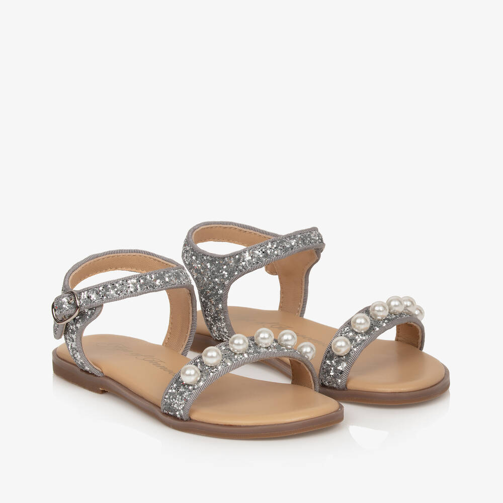 Add an element of sparkle to any outfit with these silver glittery sandals for girls, handcrafted by Age of Innocence. Decorated with beautiful faux pearl embellishments on the front for a feminine look, they have a buckle-fastened strap around the ankle. Lined in soft leather with a lightly padded insole, they have a flexible non-slip rubber outsole.