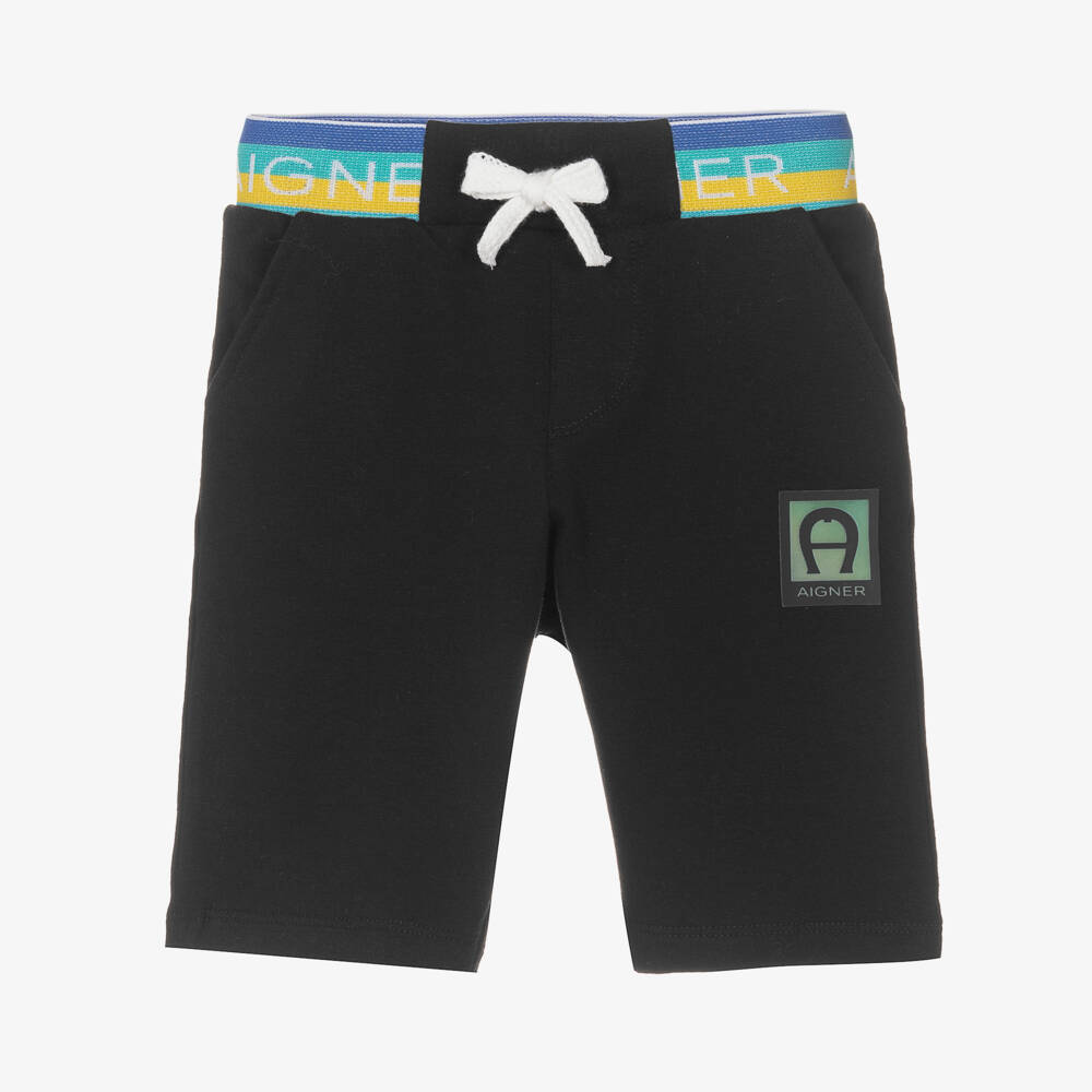 Black shorts for baby boys by German designer AIGNER, made from soft and stretchy cotton jersey. Designed for comfort and easy dressing, these casual shorts have a stretchy blue and yellow striped logo waistband, with decorative tie strings and pockets on the front and back. There is a rubberised holographic signature 'A' horseshoe logo on the front.