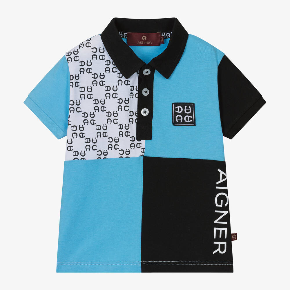 A blue and black polo shirt for baby boys from AIGNER, made in soft and comfortable cotton jersey. In a cool, colourblock design, it features the brand's signature 'A' horseshoe logo and a bold white logo print. It is styled with short sleeves and fastens neatly with branded buttons.